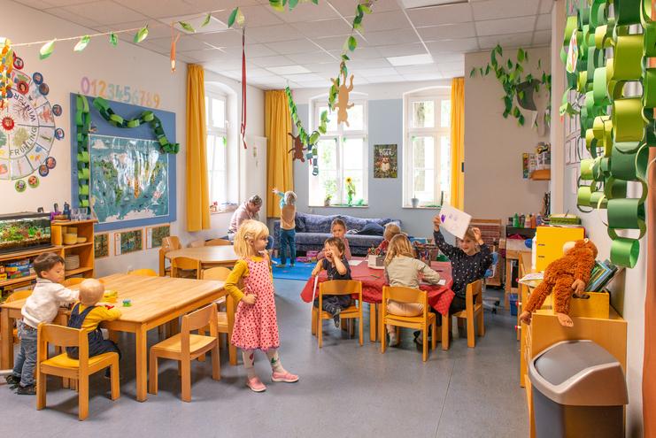 Im großen Gruppenraum können die Kinder spielen, lesen, malen und basteln. Außerdem wird hier gemeinsam, gruppenintern gegessen.